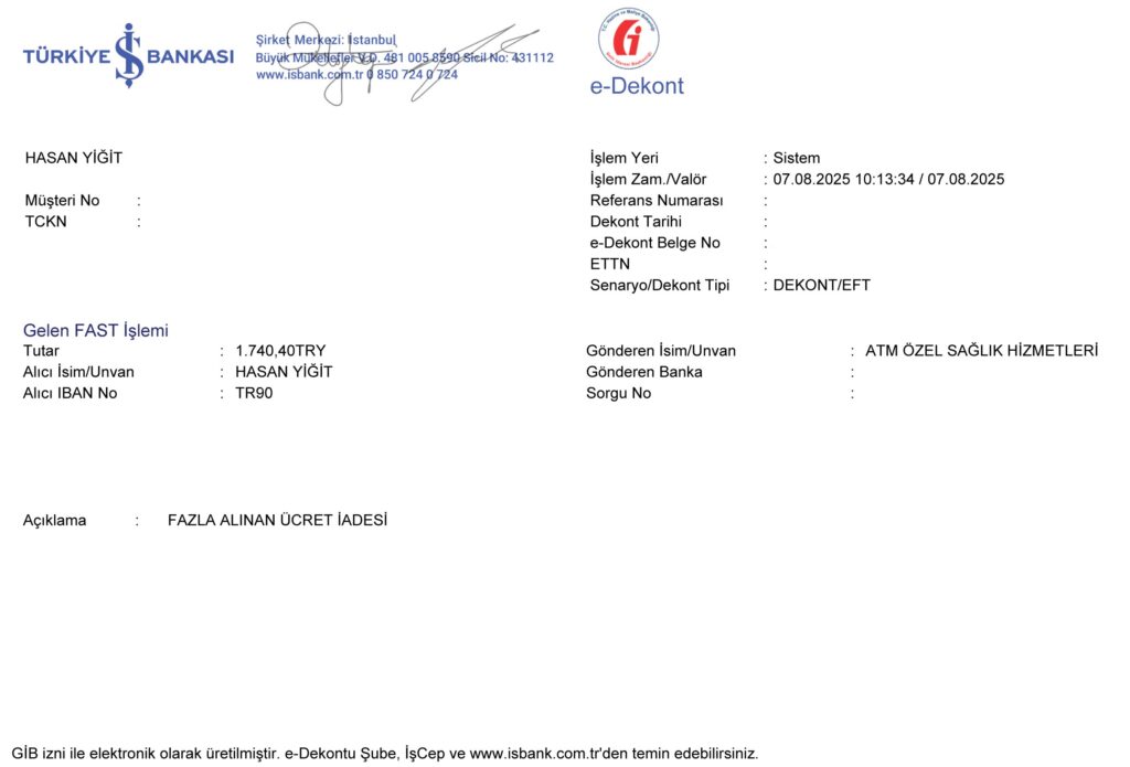 Özel Hastanelerden paranızı iade alabilmek için Fatura almanız gerekiyor. Birde Faturada Muayene Bedeli veya Hastane Tedavi Hizmetleri veya buna benzer bir kalem yazması lazım. Benimkindeki gibi