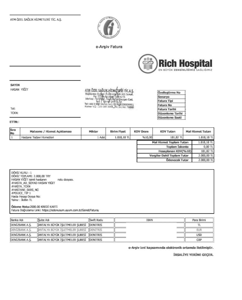 Geçenlerde Antalya da Özel Rich Hospital’a Cildiye de yaşadığım bir sorun ile ilgili muayene ye gittim. Telefon da kaç TL olduğunu sordum 2.000 TL Muayene Parası + 50 Katkı Payı olduğunu söylediler. Gitti muayenemi oldum ve 2050 TL ödemesini yaptım, bilgili bir Vatandaş olarak Hastaneden Faturamı istedim. Mail adresime gönderdiler…